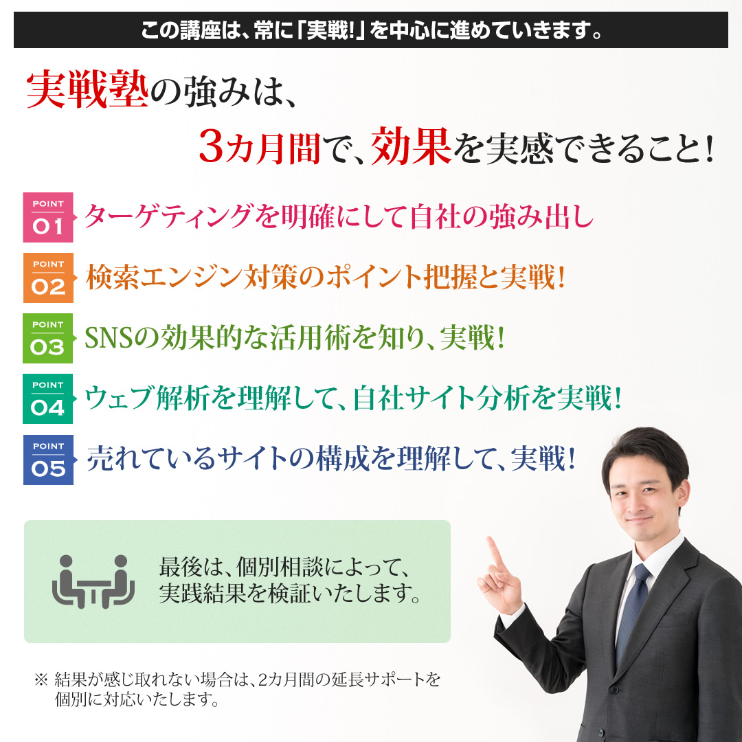 報告会後、2週間以内にどのような改善をするかを確認して終了いたします。 2週間以内に、個別相談の時間を持つことで、全講座終了となります。 |