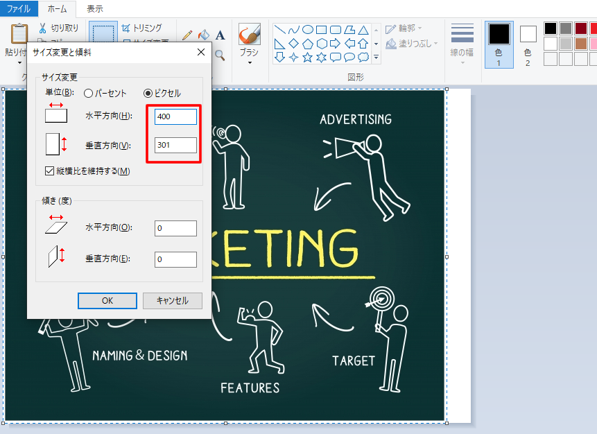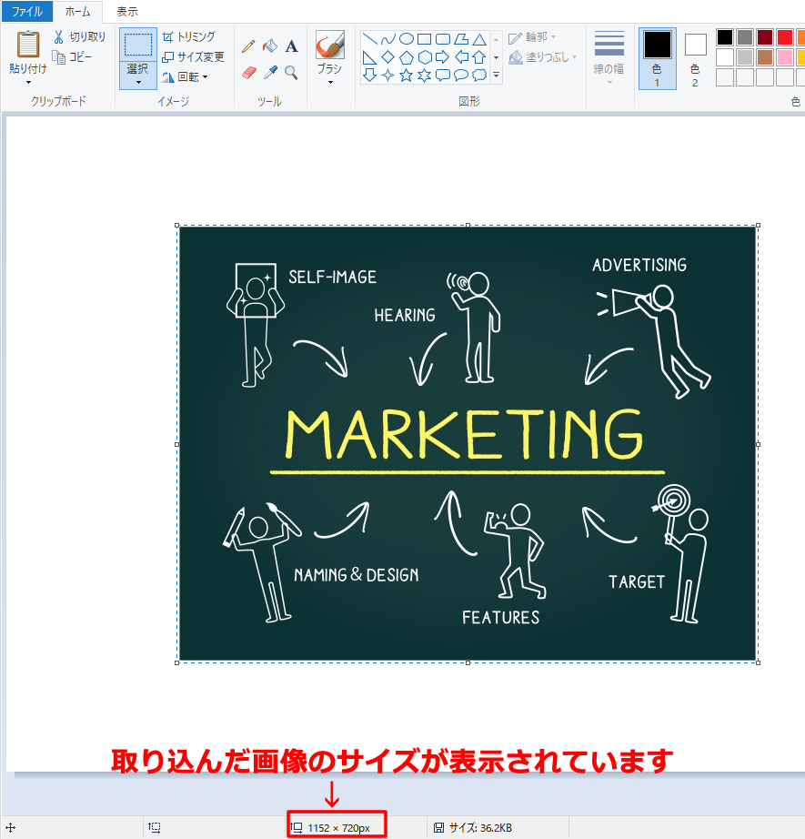 - 画像が表示されて、右上にサイズが表示されているので、確認する