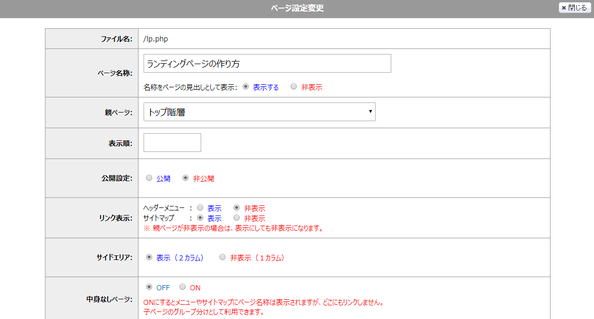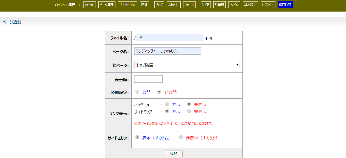 追加ボタンをクリック後、ページ管理の画面に変わります。