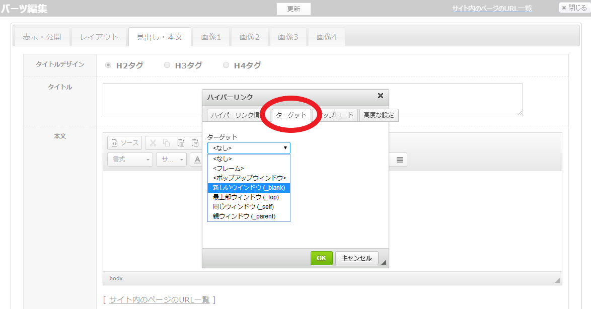 選択すると、リンク先をクリックしたとき、新しいページとして開きます。
