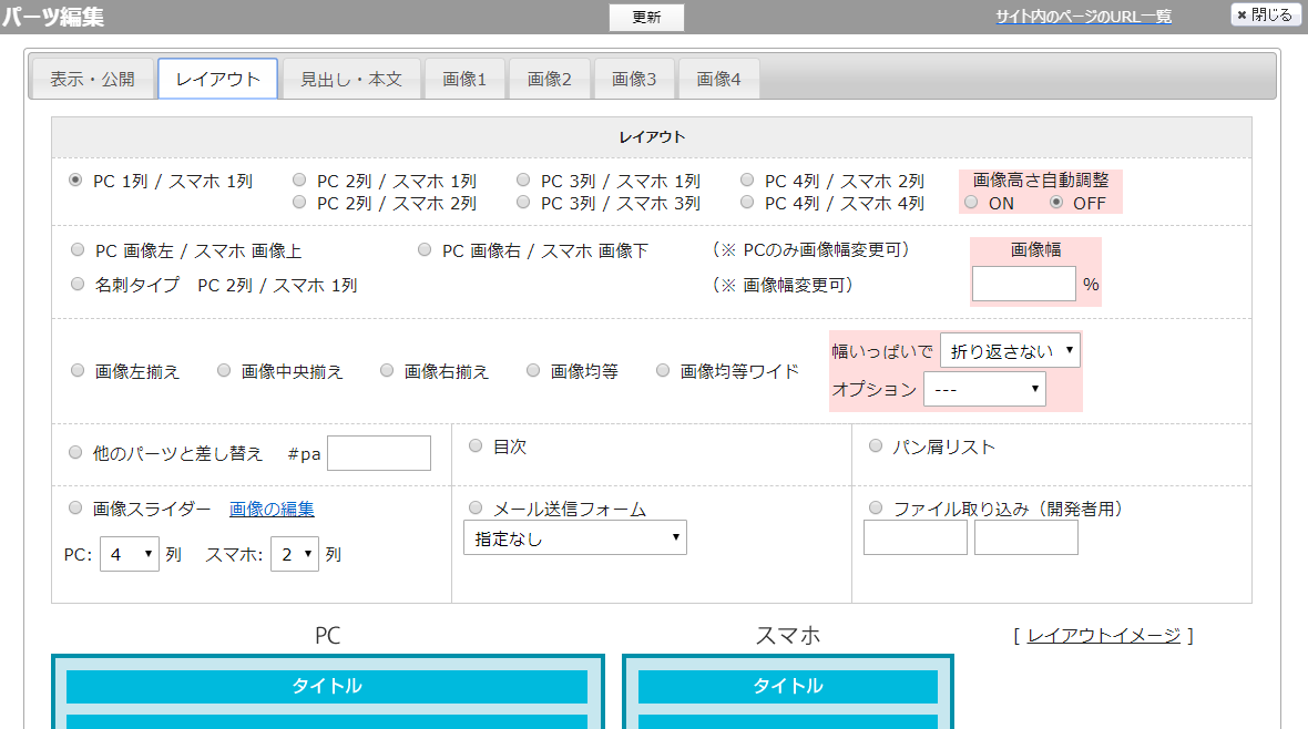 ① 「PC1列/スマホ1列」・・・PC表示の場合、列1枚まで画像を挿入